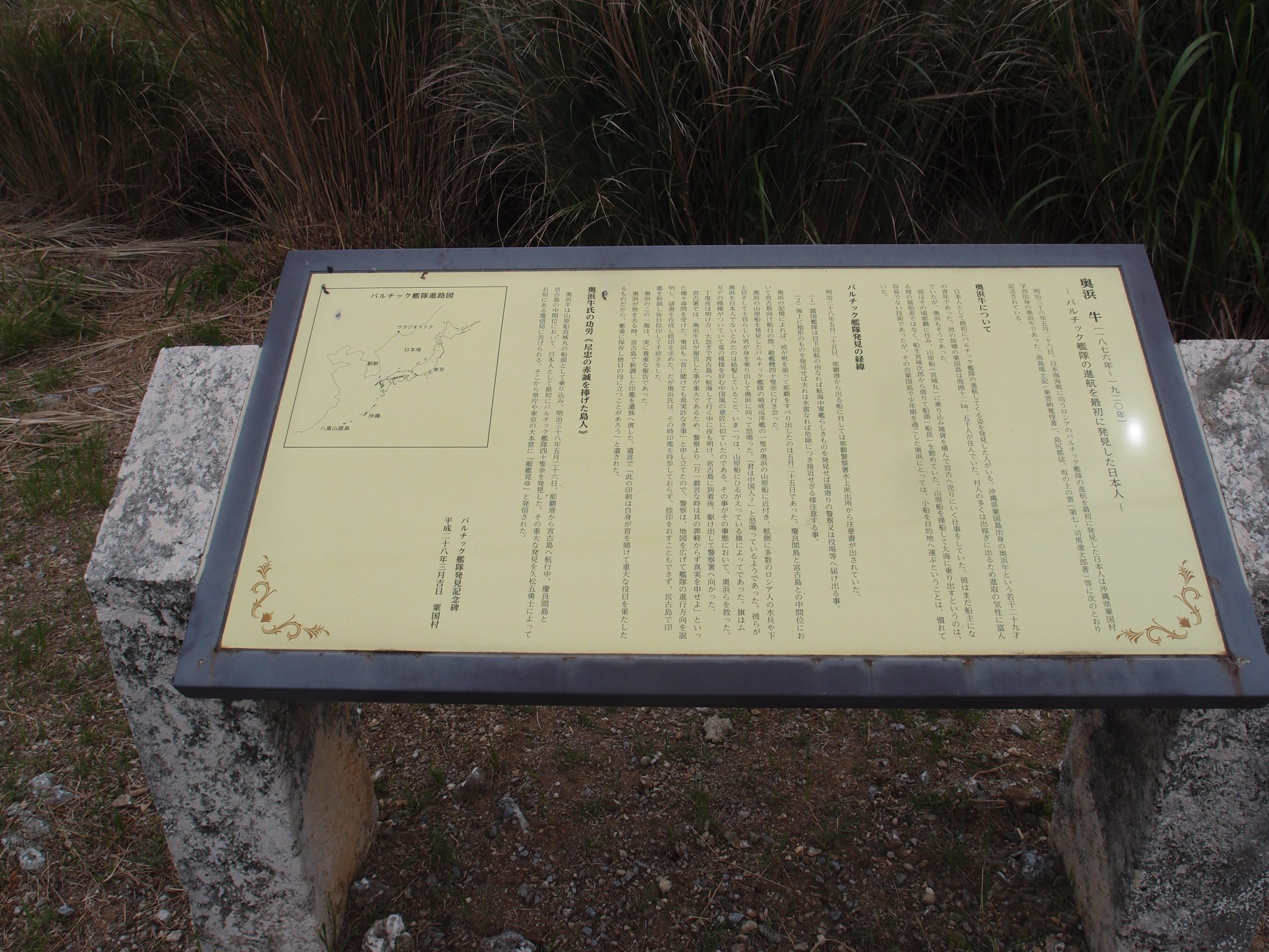 登山一覧沖縄本島ではもう登る山も少なくなり、大分前の記録ですが、2023年5月4日粟国島へ、一等三角点を探しながら山歩しました。丘登り、さんぽ島一周しました。粟国島良いとこ、船旅で十分楽しめました。また、山頂付近に、日露戦争の1905年5月バルチック艦隊を発見した日本人は粟国島出身の奥浜 牛さんで、(‘ω’)ノその発見が宮古島の久松五勇士に繋がったと初めてしりました。牛さんも英雄ですね(^_-)-☆